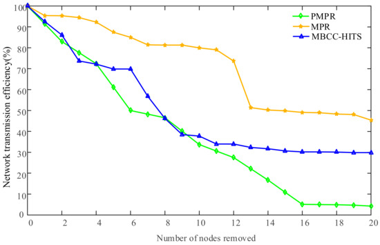 In the static deliberate attack mode, the IEEE118-Bus system is also carried out to assess the node importance. The identified key nodes are removed, in turn, by the proposed modified PageRank algorithm (PMPR); the modified PageRank algorithm (MPR), which takes the importance of nodal load, nodal load capacity, and network topology into account [23] but does not consider the node types; and the model based on co-citation (MBCC)-hypertext induced topic selection (HITS) algorithm (MBCC-HITS) [25]. The corresponding transmission efficiency values are shown in Figure 5.
