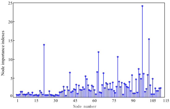 For verifying the practicability of the proposed modified PageRank algorithm, key nodes were identified in an actual operation power grid. The directed-weighted model of a provincial power grid simulation system in China was established, where the corresponding electrical parameters were known. The node importance index values of the provincial power grid were obtained as shown in Figure 6. According to the descending order, the first 15 non-generator nodes were selected as the key nodes of the system, as shown in Table 3.