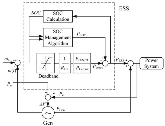 The proposed method of ESS on generation plant is shown in Figure 3. In this configuration, as ESS replaces the governor, ESS receives the generator angular speed (), which goes into droop control block () and generates the signal. For the SOC management, after SOC calculation [7,36,37], SOC signal (SOC) and angular speed deviation () are required for operation of the SOC management scheme. Those outputs for SOC management () and frequency regulation () becomes the total output of ESS () as in Figure 3.