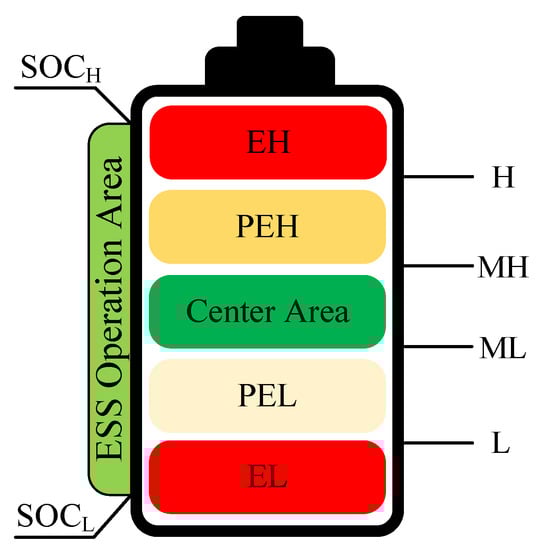 In this study, the SOC of the battery is divided into five states of operation, as shown in Figure 4. The SOC management algorithm is designed to settle down in the center of SOC where ESS can easily charge or discharge in accordance with the grid frequency, named the Center Area. In case SOC becomes slightly higher than this Center Area, we make the state of the battery enter into its pre-emergency high (PEH) state, which happens when it exceeds a SOC value of medium-high (MH). In this state, ESS tries to discharge for the management of SOC (i.g., reducing SOC), which is a relatively small amount of power, compared to that of the higher SOC case. When the SOC rises in the PEH state and exceeds the high value (H), the state of the battery reaches emergency high (EH). In this state, ESS also intends to reduce the SOC value and discharge the higher power than the power in PEH toward Center Area. In case the SOC value drops under the medium low (ML) value, the state of the battery becomes pre-emergency low (PEL). In this state, the battery tries to charge to increase the SOC to approach Center Area. If the SOC decreases further and cross the low value (L), the state of the battery reaches the emergency low (EL), where the battery has to be charged [34].