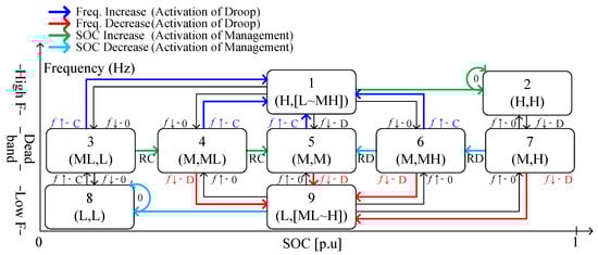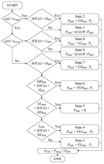 The condition changes of SOC and frequency in every moment result in state transition and ESS output power change for FR and SOC management. This state transition can be expressed with state machine as in Figure 6. The advantage of the state machine is to indicates which factor affects the movement of the state to another state. In this research, state is named as State 1 to 9, and in bracket below the numbers, the first letter indicates the high-, medium-, or low-frequency, and the letter behind indicates the level of SOC. The state movement, such as moving from State 1 to 2, from State 3 to 4, or State 4 to 5, results from the SOC increase, as indicated with the arrow. Likewise, in SOC decrease case, the movement of state is from State 9 to 8, State 7 to 6, or State 6 to 5. The state change from State 3∼6 to State 1 indicates the case with the frequency increase. Similarly, in case the frequency drops and crosses from the dead-band, state changes from State 4∼7 to State 9 as arrows. The movement of state can be affected by a change of frequency and SOC factor, and we may recognize having an influence of certain factors (SOC and frequency) on state movement using state machine. On the basis of these conditions, we may illustrate a flow chart as shown in Figure 7 and in this research, we develop the C code based on the flow chart in Figure 7.
