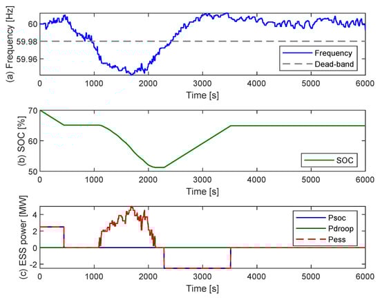 Example case of operation by influential factors (Freq. and SOC) to ESS output power: (a) Grid frequency, (b) SOC, (c) ESS power.