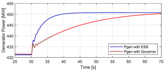 In case of governor as in Figure 2a, the generator speed regulation response of the governor is comparatively slow due to the mechanical response of the governor. The mechanical control of governor action becomes the valve adjustment, which controls the quantity of the steam from the boiler to the generator through the valve to control generator speed. In the ESS case, ESS can be characterized as fast action as the power converter is employed; however, ESS has finite energy, and SOC must be properly adjusted to overcome this drawback.