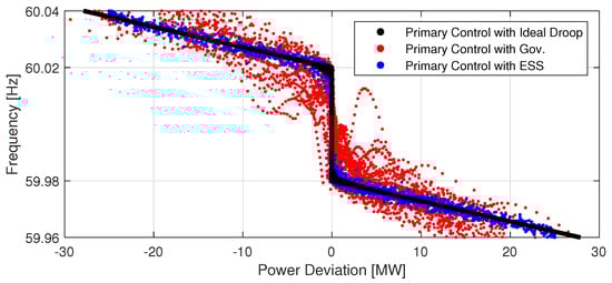 When a governor is installed for frequency regulation of the generator, the response has inherently slow characteristics due to the mechanical nature of inside of the governor. The speed response of generator with the governor is generally defined around several seconds, which has slower response than response of power electronic equipment. In the case of ESS, grid code in Korea requires the rise time of ESS should be within 200 ms, which is almost 5 to 10 times faster than the governor. In Figure 10, we indicate the case with the frequency step change to compare the two cases (the governor and ESS). As in Figure 10, the response of the generator with ESS is much more rapid than that of the generator with governor. This result implies that the supportive power can be provided to the power grid in a short time with highly enhanced dynamic characteristics from ESS, when the frequency deviation occurs. Figure 11 indicates the droop characteristics curve of between reference and measured value of ESS and governor case. This figure shows that the ESS drives almost consistently with the droop characteristic curve rather than in the case of the governor.