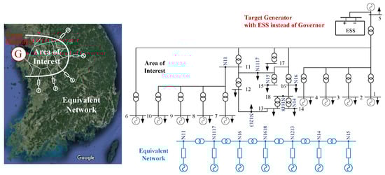 Figure 12 indicates the network in the northwest area in Korea, where 10 generators are located in area of interest, and other area is aggregated as equivalent network. The targeting generator on bus 5 is installed with ESS to improve the frequency stability. When the disturbance occurs in the network, ESS operates to reduce the impact on the generator.