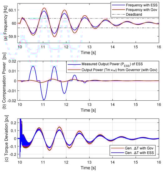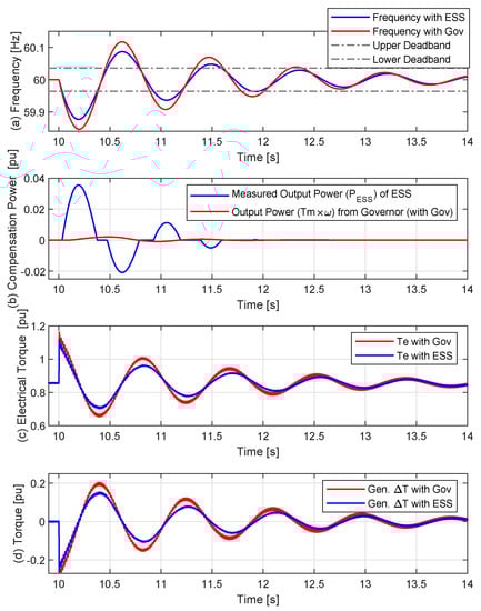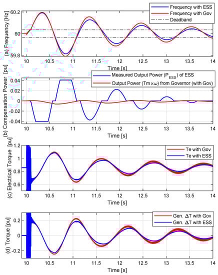 The first case indicates the generator trip, and in this study Generators 1, 2, 3, and 4 in the vicinity of the target generator are tripped simultaneously. In case the group of generators in the power system are tripped, the mismatch of the power balance significantly affects nearby generators, causing large frequency deviation. In this case study, the ESS instead of governor takes responsibility of power compensation and brings an advantage of rapid compensation, as ESS has timely appropriate compensation ability. Figure 13 indicates the frequency changes after the generator trip as shown in Figure 13a. To compensate power for this oscillating frequency, the compensation power from ESS is provided to the power system as in Figure 13b. As the oscillation is comparatively faster than governor, the governor cannot properly compensate the power; however, as ESS has an ability to provide rapidly compensation power, compensation power rapidly increases instantaneously which stabilizes the system. Due to the ESS power provision, electrical power reduces from the generator perspectives as shown in Figure 13c, resulting in the decrease of difference between the mechanical torque and the electrical torque (the generator torque deviation ) as in Figure 13d. As the generator torque deviation has the less change in case of the ESS installation instead of governor, frequency eventually reduces as in Figure 13a.