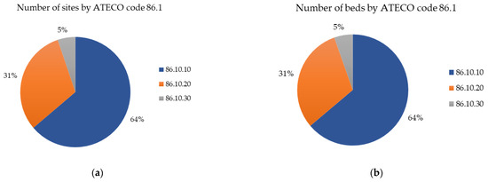 (a) Number of sites by ATECO code 86.1, (b) number of beds by ATECO code 86.1, (c) number of workers by ATECO code 86.1, and (d) accreditation of sites to the NHS.