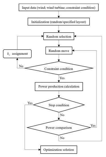 The RS algorithm was proposed by Feng and Shen [16] to seek the optimal layout of a wind farm. It optimizes the wind farm layout iteratively by moving a randomly chosen wind turbine from its original position to a new position step by step.