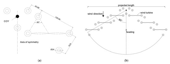 All the platforms in the wind farm are assumed to yaw synchronously with the same angle. Thus, the minimal distance of the platform is set to 1.05 times of the projected length, as illustrated in Figure 2b.