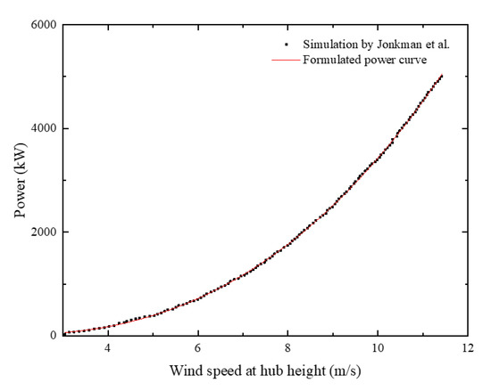 The power curve of the NREL 5 MW wind turbine [28], which was obtained by the CFD simulation of Jonkman et al. [28], is fitted by a cubic polynomial with a mean relative error of 2.1%, as shown in Figure 3. Therefore, as a function of wind speed, the power output of a NREL 5 MW wind turbine is formulated by: