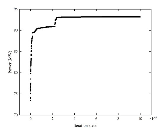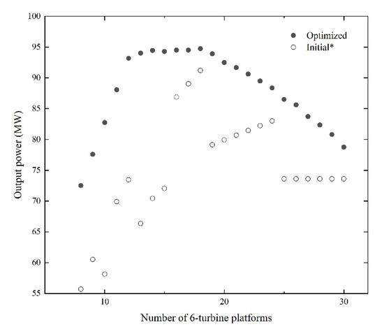 The power productions of each optimized layout from 8 to 30 six-turbine platforms are presented in black points in Figure 4. The power outputs of each initial layout are also presented in white points. Obviously, the production of every initial layout is improved after optimization. The results show good performance of the optimization methodology.