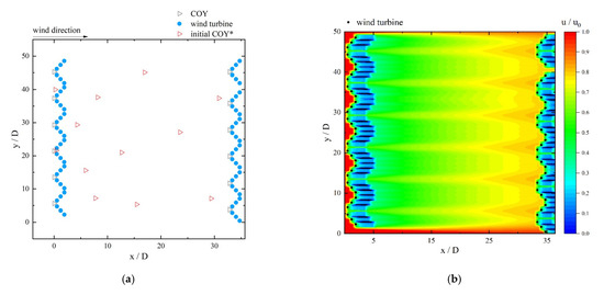 Optimized layout of 12 six-turbine platforms: (a) position of the platforms; (b) distribution of the velocity. * Not the initialization of the shown optimization, just to illustrate the way of random initialization.