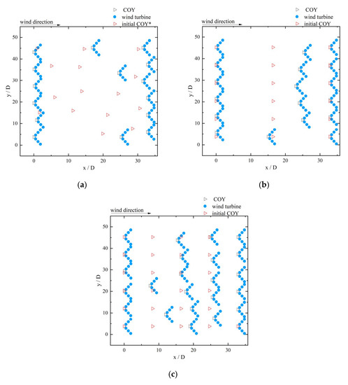 As shown in Figure 4, the optimized power output has a rapid increase at the first, then a very slow increase, and a decrease at last, with increasing number of platforms. The maximal number of platforms in the cross-wind direction is six in a row. The wind turbine wakes of added downwind platforms will not affect other platforms until the number of platforms is 12, as shown in Figure 5. The output power of every added platform is directly counted in the total output power of the wind farm before 12 platforms. Therefore, the optimized output power has a fast linear increase between 8 and 12 platforms. When the number of platforms is between 13 and 18 in the wind farm, the platforms cannot be arranged in only two rows in the cross-wind direction, as illustrated in Figure 6a,b. Downstream wind turbines are affected by the wakes of two upstream wind turbines at most. With an increasing number of wind turbines, more turbines generate power while more turbines are in the wakes of other upstream turbines. A very slow increase of output power in this section means the increase is nearly counteracted by the deficit. When the number of platforms is larger than 18, more wind turbines are in the wakes of multiple upstream turbines, as illustrated in Figure 6c. The power production begins to decrease with the increase of platforms, meaning that the deficit becomes the dominating effect. Even with a special uniform initialization, all initial layouts have room to improve the wind resource utilization. However, obviously, there are more potentials in the sparse layouts. The proposed methodology has indeed the ability to tap these potentials.