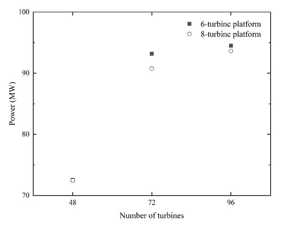 The layout of the wind farm adopting the eight-turbine platforms with 48, 72 and 96 wind turbines is also optimized respectively. Figure 7 and Table 4 present the power output of optimized layouts. It can be observed that the output power of all cases with six-turbine platforms is larger than that with eight-turbine platforms. The eight-turbine platform has a bigger size because it has more wind turbines. This means that there are fewer eight-turbine platforms, which can be arranged in a line in the cross-wind direction, than six-turbine platforms in the wind farm. The difference is four wind turbines. In the situation with the same total number of wind turbines, the wind farm adopting eight-turbine platforms has more turbines in the wakes than the wind farm adopting six-turbine platforms. Therefore, the wind farm with eight-turbine platforms has lower power production.