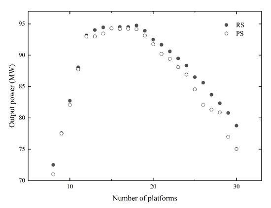 Compared with the optimized outputs between 8 and 12 platforms, the power outputs of uniform layouts show a similar increasing way. With increasing turbines of the last row, as shown in Figure 6b,c, the power outputs of uniform layouts also increase linearly. However, the increase slows down with the increase of rows. At last, in the fifth row, the added platforms cannot output any power, meaning that the inflow velocity of the last row is smaller than the cut-in wind speed of the turbine because of strong wake effects.