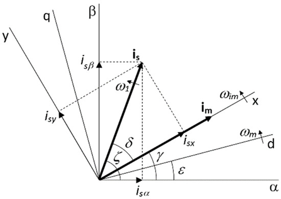 It is possible to obtain the following equations for the stator current components from the voltage Equations (1) and (2). After the Laplace transformation and by neglecting changes of the magnetizing current, the relations for the stator current space vector components in the x-axis and y-axis can be defined as: