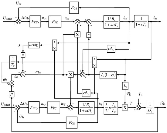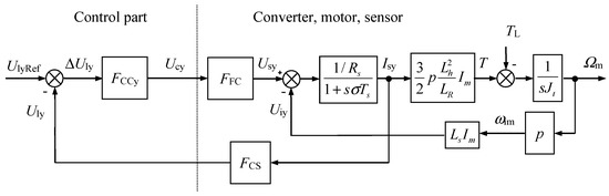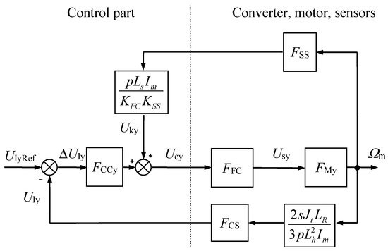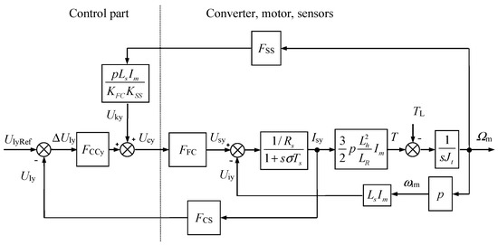 Sensorless drives, sensor fault tolerant control and applications of artificial intelligence belong to the top topics in the field of sophisticated control methods for electrical controlled drives. In these cases, the vector control algorithm is mostly used as a basic control method [9,10,11,12,13,14,15]. This is the reason why it is important to suppress the aforementioned current control steady-state error, to reach the best possible performance of the drive. Equations for the elimination of the coupling between the flux- and torque-producing stator current components are very often used for vector-controlled induction motor drives. The aforementioned coupling occurs in the voltage equations expressed in the rotating reference frame [x, y] oriented on the rotor flux space vector. It is well known from the literature [16,17,18,19,20] that the decoupling equations are important for independent control of the stator current space vector components. Moreover, the coupling can deteriorate the current responses in the high-speed range if it is not well compensated [20].