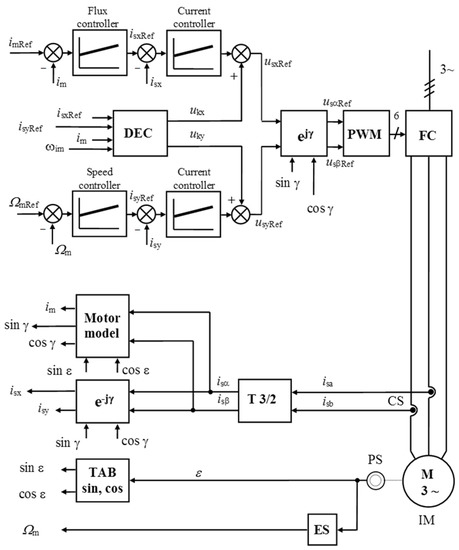 FC—Frequency Converter; CS—Current Sensor; PWM—Pulse Width Modulation; PS—Position Sensor; ES—Evaluation of Speed; IM—Induction Motor; DEC—Decoupling block.