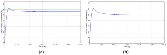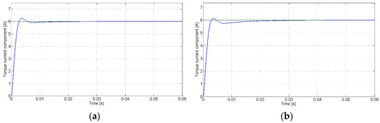 Simulation results: reference (green) and actual (blue) torque-producing stator current with decoupling; (a) total moment of inertia Jt = 0.043 kgm2 (including DC machine), steady-state value of torque-producing stator current is 6 A; (b) total moment of inertia Jt = JM = 0.013 kgm2 (induction motor only), steady-state value of torque-producing stator current is 6 A.