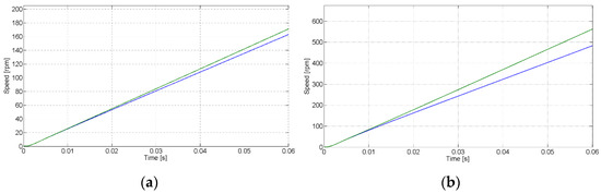 Simulation results: (a) actual rotor speed for torque-producing stator current without decoupling according to Figure 8a (blue) and with decoupling according to Figure 9a (green), total moment of inertia Jt = 0.043 kgm2 (including DC machine); (b) actual rotor speed for torque-producing stator current without decoupling according to Figure 8b (blue) and with decoupling according to Figure 9b (green), total moment of inertia Jt = 0.013 kgm2 (induction motor only).