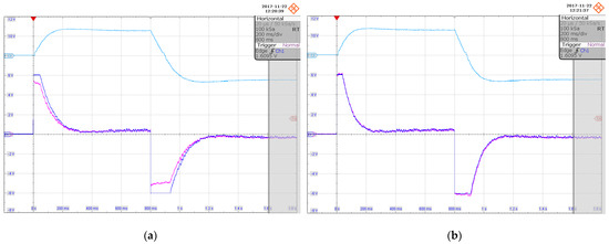 Experimental results: acceleration from 0 to 500 rpm and reversal, actual rotor speed (light blue), the reference (dark blue) and actual (pink) torque-producing stator current, total moment of inertia of Jt = JM = 0.013 kgm2 (induction motor only), current scale 2 A/div, speed scale 400 rpm/div, time scale 200 ms/div; (a) without decoupling; (b) with decoupling.