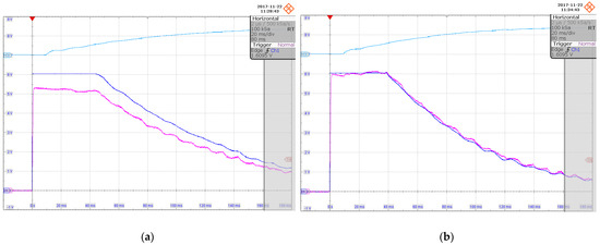 Experimental results: detail of acceleration from 0 to 500 rpm, actual rotor speed (light blue), the reference (dark blue) and actual (pink) torque-producing stator current, total moment of inertia of Jt = JM = 0.013 kgm2 (induction motor only), current scale 1 A/div, speed scale 400 rpm/div, time scale 20 ms/div; (a) without decoupling; (b) with decoupling.
