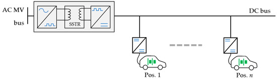 The UFC station is assumed to be directly connected to an MV microgrid through an AC/DC power converter interface. UFC stations are made by several chargers, each equipped with a DC/DC fast-charging device, according to the DC-coupled architecture. This solution includes solid state transformer technology, whose recent improvements allow enhanced power density and efficiency of the fast-charging infrastructures [5]. A scheme of the considered configuration is shown in Figure 1, where n positions (i.e., single stall units) for the PEVs’ chargers are considered. A local renewable-based generation and a storage device can be also included in the infrastructure of the UFC station.