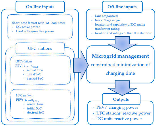 In particular, inputs of the procedure include offline and online information. The offline inputs, which can be changed offline if modifications occur, are the line ampacities, admissible bus voltage ranges, transformer rating, the capability curve of the DG units, and the location and rating of the UFC stations connected to the microgrid. Online inputs are those that must be updated at each time interval, they include: the forecast of the active and reactive load demand and of the power produced by the DG units, as well as the number and location of the PEVs connected to the UFC stations, together with their required SoC at departure and the initial SoC at the considered time interval.