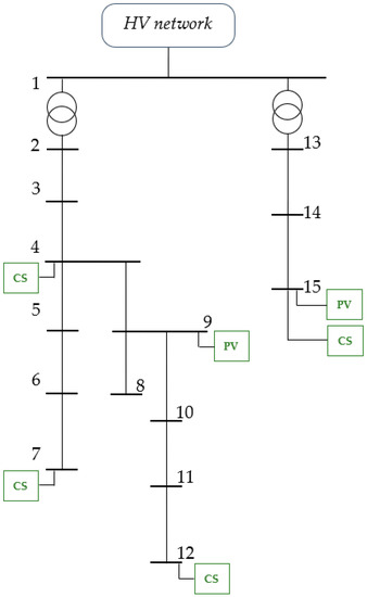 In this Section some results of the application of the proposed real-time procedure are reported with respect to the microgrid schematized in Figure 3, which refers to the 12.47 kV, three-phase, balanced Cigrè benchmark system [24]. It includes two feeders with 15 buses; the two feeders are connected to the upstream network through two 115/12.47 kV transformers of 50 and 20 MVA. Note that, to accommodate a larger load demand, the size of the first transformer has been modified with respect to that of the original benchmark system.