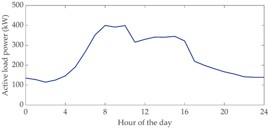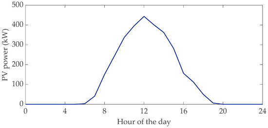 The data of the loads are reported in Table 1. The loads are assumed to vary during the day according to a typical profile [24] as that shown in Figure 4 which refers to the load connected at bus #6. Two photovoltaic (PV) units are connected to the buses #9 and #15, each of 0.5 MW rated power. Figure 5 shows a typical daily profile of the PV connected at bus #9 [25]. Four charging stations are considered connected to the buses #4, #7, #12, and #15. Each UFC station is equipped with four 350 kW-DC/DC extra fast chargers and connected to the microgrid through an AC/DC power converter having a rated power of 1.4 MW. It is assumed, that these converters can be controlled to provide the regulation of the reactive power. The overall efficiency of the charging station is 97% [22].
