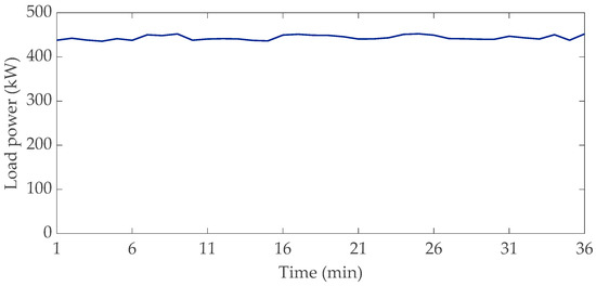 During the period of the simulation, the PV power production and load requests are assumed to vary according to a uniform distribution in a range of ±2% around the corresponding hourly mean value. As an example, Figure 6 reports the power profile of the load at bus #6 related to the considered time.
