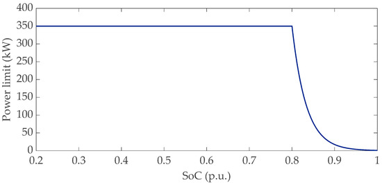 The battery on board of each plugged-in vehicle has a capacity of 100 kWh, which is a typical size of the battery that can support ultra-fast charging [26]. According to constraints (5), the upper limit of the charging power for this typology of battery depends on the SoC. In this application, the assumed power limit is reported in Figure 7 for different SoC values, this limit being identified according to the requirements of the battery connected to the UFC station in terms of SoC dependence, charging time, and battery lifetime preservation [23]. With reference to a 100 kWh battery with a SoC of 20% at the arrival, about 20 min are required to reach 90% of SoC; if a value of 80% of SoC is desired at the departure, then about 10 min are needed.