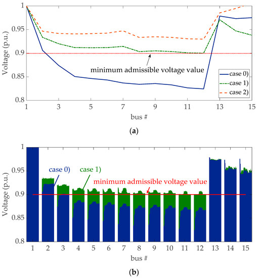 Regarding the microgrid technical constraints, it is worth noting that the uncontrolled case implies unfeasible grid operation in terms of allowable bus voltage. As an example, in Figure 8a the bus voltage profile at 11.02 a.m. is reported, in which the voltage reaches its minimum value; in the figure, the voltage profiles corresponding to the three case studies are shown. In Figure 8b the bus voltage values at each time interval are shown. For the sake of clarity, only the results corresponding to case (0) and case (1) are reported.