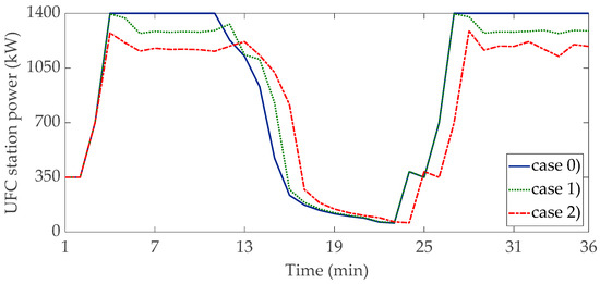 The power profile of the UFC station at bus #12 (UFCS3) is reported in Figure 9 with respect to the three case studies.