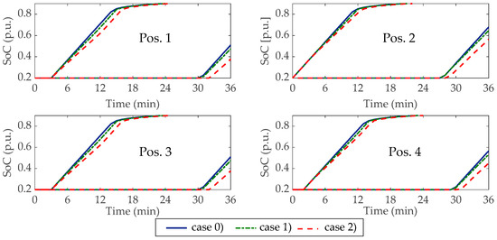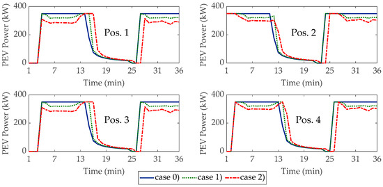 In Figure 10 the powers absorbed by all PEVs plugged-in at the UFCS3 during the considered period are reported with respect to the three case studies. The corresponding SoC profiles are reported in Figure 11. By comparing the profiles of case (1) and (2) with those of case (0), in Figure 10 and Figure 11, the ability of the proposed approach to properly manage the power of the vehicles to meet the vehicle constraints is evident.