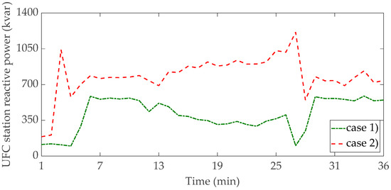 Compared to case (1), the increased power reduction in case (2) depends on the increased reactive power support requested from the UFC stations. In Figure 12, the reactive power provided by the UFCS3 is reported with respect to case (1) and case (2) (obviously, there is no reactive support from the UFC stations in the uncontrolled case).