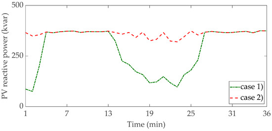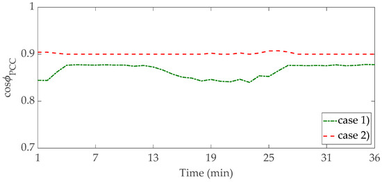 Figure 13 reports the reactive power provided by the PV system connected to the bus # 15. In this case, the increased contribution of reactive power to satisfy the constraint on the power factor (0.9) imposed at the PCC is also apparent. The results in terms of the power factor during the considered power profile is reported in Figure 14, in the cases (1) and (2), where the satisfaction of the minimum power factor is clearly apparent.