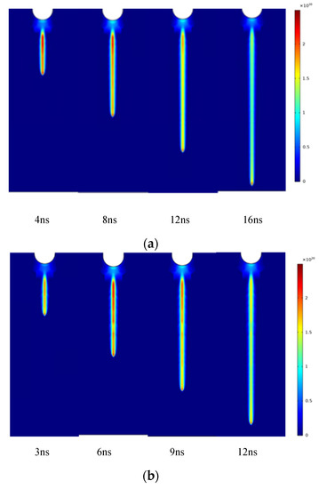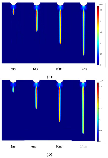 In Figure 2a–c are one-dimensional diagrams of electron concentration in the axial direction during the development of streamers with electron concentration at room temperature and different humidity respectively. Figure 2a shows dry clean air; Figure 2b shows 40% relative humidity, and Figure 2c shows 80% relative humidity. The curves in the figure show the changes of electron concentration on the symmetry axis of the model during the streamer discharge time of 2 ns to 14 ns. Figure 3 is a two-dimensional cloud diagram of electron concentration during streamer development.