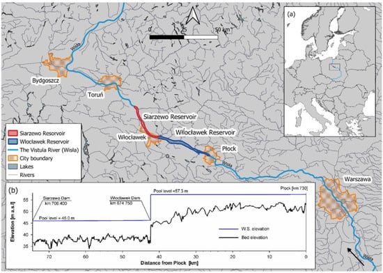 Location configuration of the coupled dams (Włocławek and Siarzewo) (a), along with the bed and the water surface longitudinal profiles for the reservoirs (b).