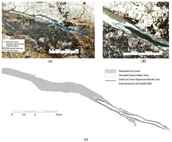 Ice cover expansion at the site area (Włocławek Reservoir) in 6 February 2021 (Sourced: Land Viewer Website) (a), zoomed in open water boundary (b), comparison between open water borders in numerical simulation and satellite imagery photo (c).