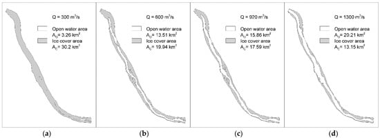Ice cover expansion following the water withdrawal with outflows of 300 (a), 600 (b), 920 (c) and 1300 m3/s (d).