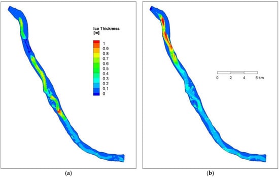 Another cause could be the inflowing ice affected by the water velocity and drag, giving rise to the downstream accumulation. In this study, the open water area is considered to be the frazil ice formation zone, and the dynamic ice processes cause the ice accumulation downstream of the reservoir. In Figure 4, the ice thickness after 600 and 920 m3/s discharge, without reducing the discharge to 300 m3/s, is provided. Needlesss to say, the water discharge for the both reservoirs was considered to be the same for each case. Therefore, the water discharge in the domain was considered to be constant. It can be observed in the Figure 4 that the ice accumulation in the case of 600 m3/s discharge was less regulated as a result of narrowness in the open water area, wherein the reservor section of the Siarzewo Dam is located.