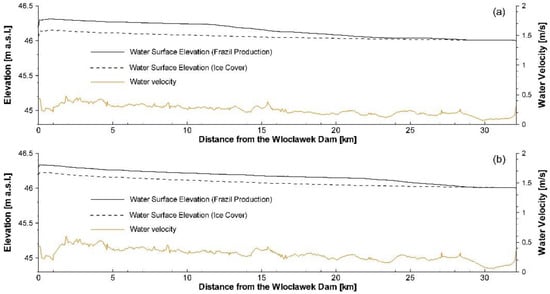 Thalweg longitudinal profiles of the water surface elevation for ice cover formation and frazil production conditions in Siarzewo reservoir, in the water discharge of 600 (a) and 920 m3/s (b) settings, from the Włocławek Dam.