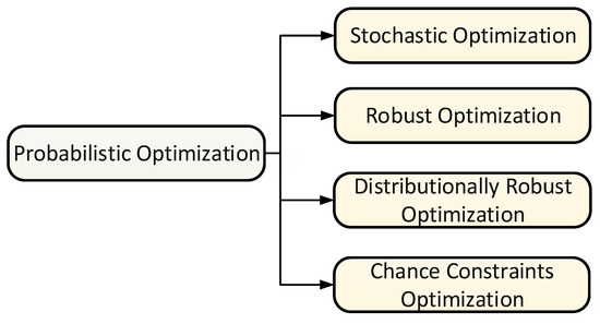 Stochastic programming is used to solve optimization problems in which the majority of the parameters are probabilistic [32]. Probabilistic optimization can make efficient use of information, both in terms of selecting evaluation points and the message they convey. It can handle many sorts of noise and adapts to various aspects of optimization issues. Unlike deterministic optimization, probabilistic optimization techniques discover the best solution for data with randomness [33]. As indicated in Figure 1, there are multiple probabilistic optimization categories: stochastic optimization, robust optimization, distributionally robust optimization, and chance-constrained optimization.