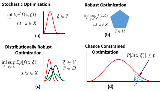A distributionally robust optimization or min–max stochastic programming model act as a bridge between robust and stochastic optimization. It usually takes the form, as shown in Equation (3). where x is the decision variable that belongs to set X, P is the probability distributions that belongs to an ambiguity set D, is the random variable, and is expected value of the random variable [37]. Distributionally robust optimization can be graphically represented as shown in part c of Figure 2. The random variable belongs to probability distribution P where P itself belongs to ambiguity set D.