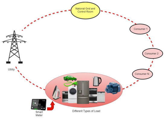 Conventional grid electrical power is sent unidirectionally from a central power station to remote users. In 2000, a smart power system concept was established with the primary goal of integrating two-way communication into the infrastructure of a standard grid system. From the generating station to the consumers, a smart power system integrates communication and information technology [2,3]. Consumers receive safe, robust, and high-quality power from a smart power system [4,5,6]. To transform a traditional grid into a smart power system, a scalable yet robust communication architecture is necessary [7]. In an electrical power system, the grid is composed of multiple energy generating, transmission, distribution, and control elements. The smart power system intelligently organizes and connects the traditional grid’s elements previously stated [8,9,10].