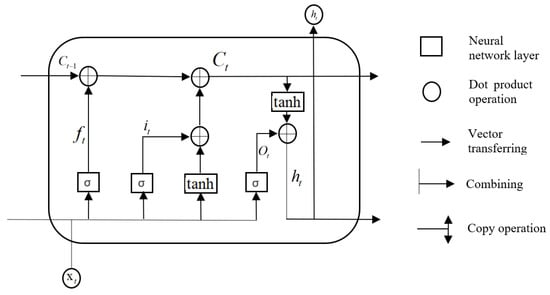 In the above formula, ƒt represents the forget gate. It is used to control whether or not to filter the hidden cellular state of the upper layer in the LSTM. it represents the input gate,t is the cell state at the previous moment, Ct is the cell state at the present moment, Ot represents the output gate, xt and ht represent the input and output at the current moment and σ and tanh represent the sigmoid function and hyperbolic tangent function, respectively. The forget gate, input gate, output gate and the weight matrix of the cell state are represented by wf, wi, wo and wc respectively. bf, bi, bo and bc represent the offset vector of the forget gate, input gate, output gate and cell state, respectively.