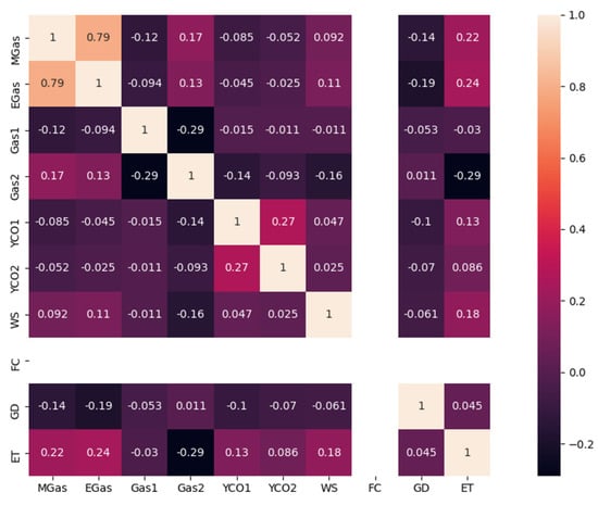 There are multiple transformations and interactions between the gas mixture and other compounds at different measuring points [32]. Therefore, the correlation between the concentration of the gas mixture and other compounds is analyzed.
