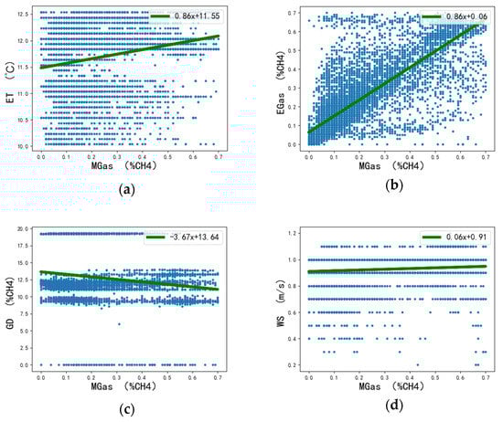 The four variables “EGas, WS, ET and GD” were selected as the input of the prediction model, and the correlation analysis between the input variables and the mixed gas concentration is shown in Figure 5. According to previous experiments conducted on methane adsorption, an increase in temperature can reduce the gas adsorption capacity and it can effectively promote the rapid desorption and diffusion. Meanwhile, the activity of the methane molecule increases, which promotes the pore expansion of coal bodies, particularly of the small gaps. This significantly improves the methane diffusion of coal bodies. The diffusion coefficient dynamically changes with an increase in the temperature. In this study, the least squares method was used for fitting, as shown in Figure 5a. A positive correlation between the concentration of mixed gas and the ambient temperature was observed, which revealed the mechanism of the dynamic process of gas diffusion proposed by Liu [34] et al.