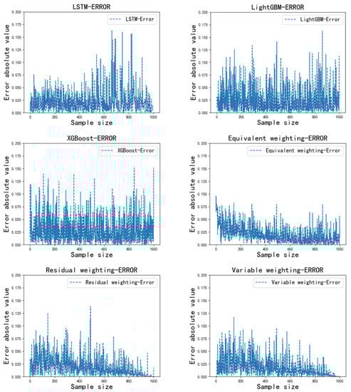 To verify the accuracy of the improved LSTM-LightGBM, the LSTM, LightGBM, XGBoost, LSTM-LightGBM (Equivalent weighting) and LSTM-LightGBM (Residual weight) were selected for comparative experiments. The errors of the different models were compared as shown in Figure 6.